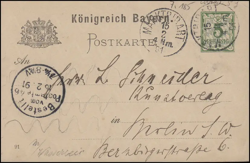 Bayern P 38/02, paragraphe 5 Pf vert DV 91: MARKT BIBART 15.2.91 après Berlin 16.2.92