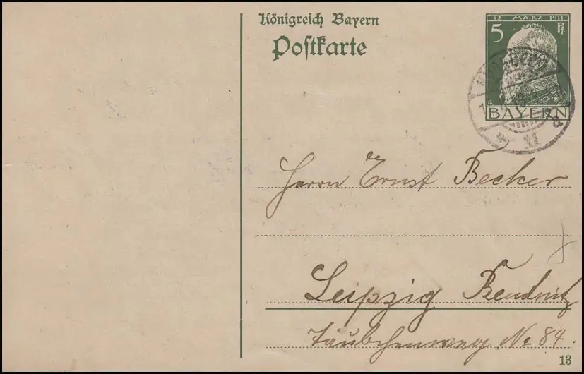 Bayern P 87I/03 Luitpold 5 Pf. DV 13: NÜRNBERG 11 - 14.8.13 vers Leipzig