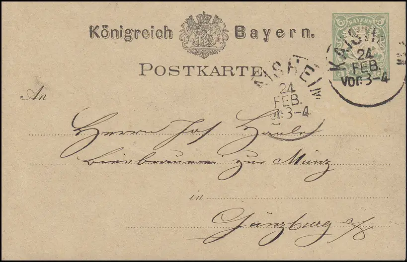 Bayern P 8II Wappen 5 Pf. KAISHEIM 24.2. vers Günzburg