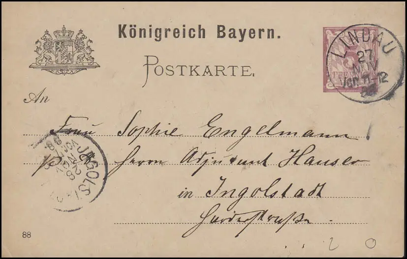 Bayern Postkarte 5 Pf. LINDAU 27.11.88 vers INGOLSTADT 28.11.89