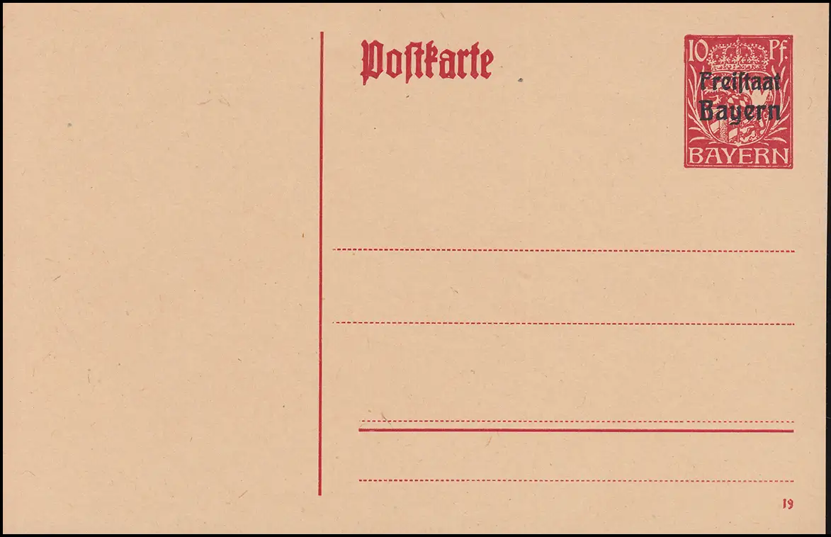 Carte postale Bayern P 109/01 Freistaat 10 Pf karmin DV 19, tel qu'il est dépensé **