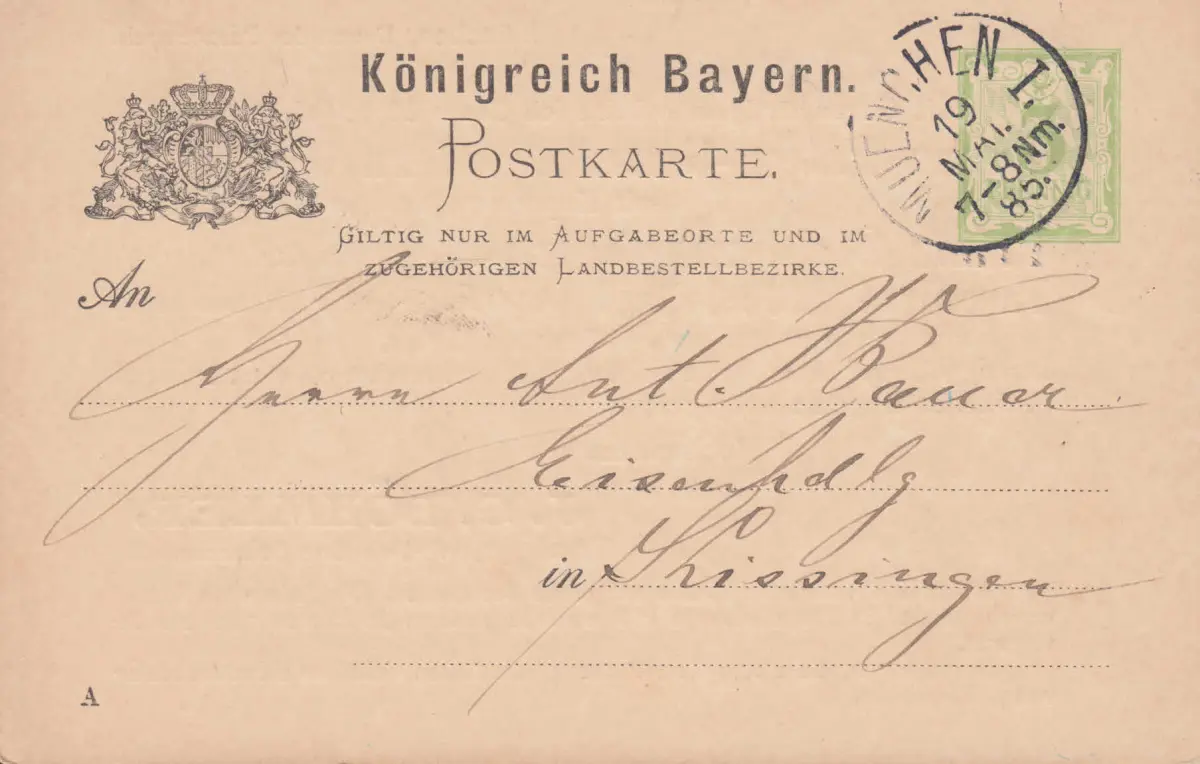 Bayern Postkarte P 29II/01 Marque de contrôle A, MÜNCHEN 19.5.1885 vers Kissingen