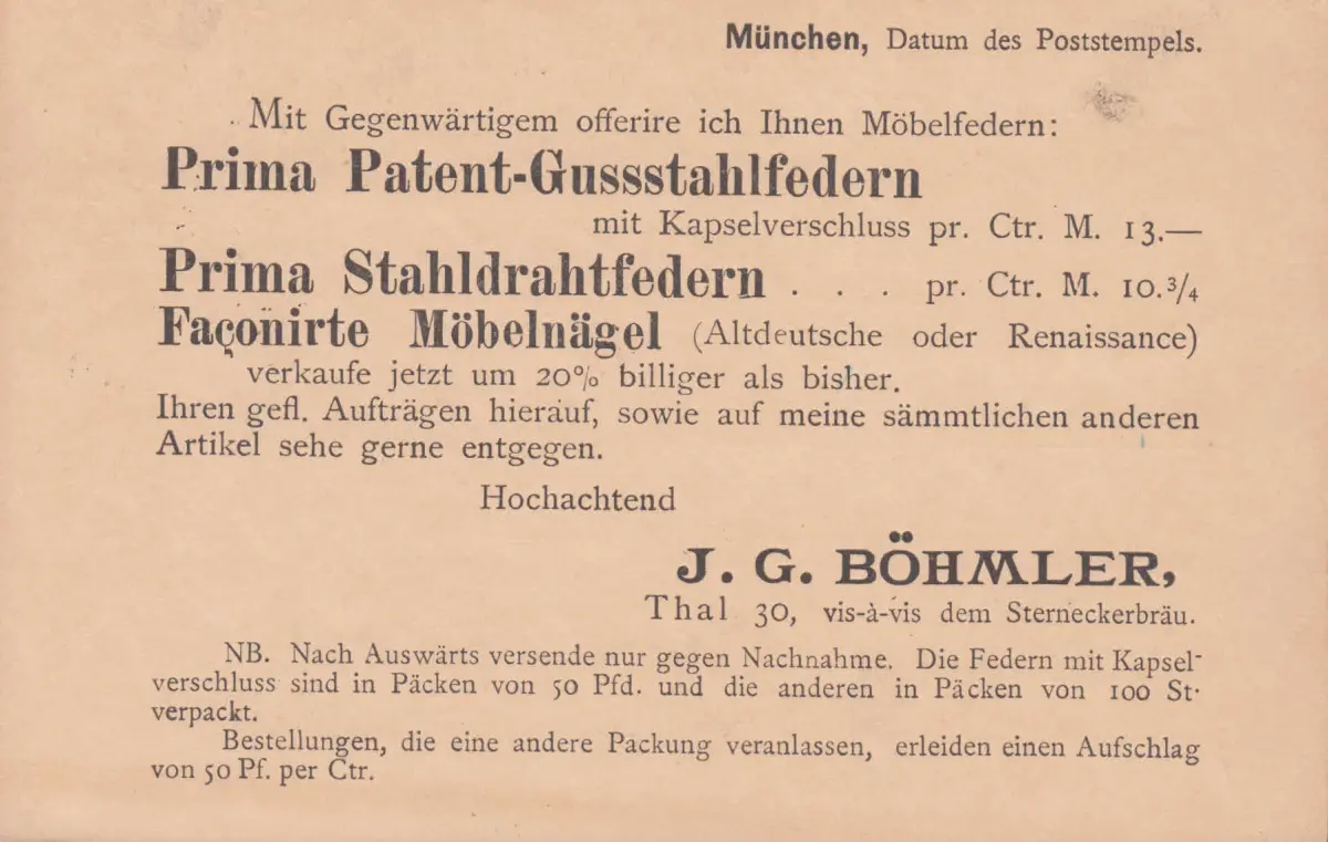 Envoi publicitaire arrière Artisanat Société Böhmler, Meuble-Federn Numéro de catalogue: P29II/01 Test: original Référence produit: 00000000029385