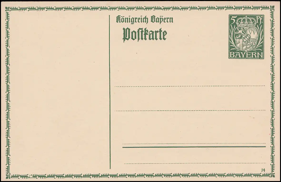 Bayern Postkarte P 93I/01 Armoiries 5 Pf Bordures ornementales DV 14 coupées, **