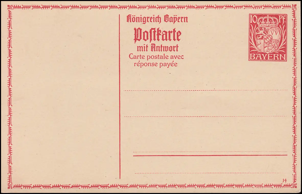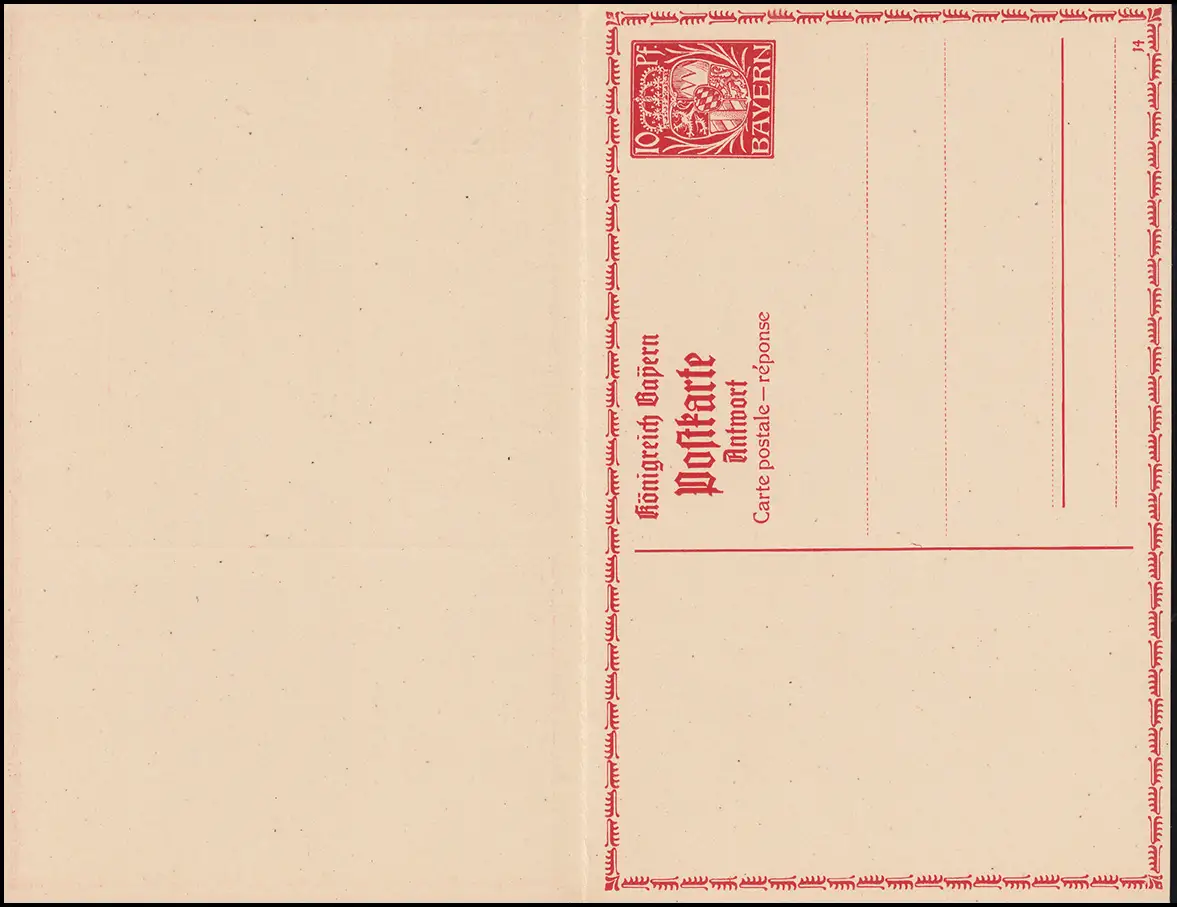 Bayern Postkarte P 96 Armoiries 10/10 Pf Bordure ornementale DV 14 coupée, **