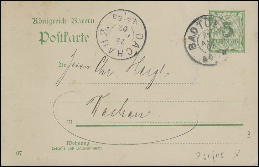 Carte postale de Bavière chiffre 5 p. BAD TÖLZ 24.4.07 après DACHAU 25.4.2007