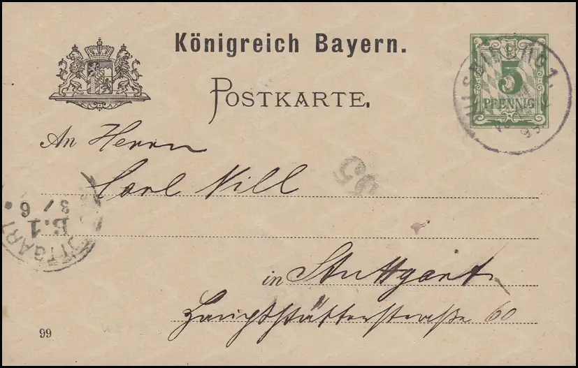 Bayern Postkarte chiffre 5 Pf vert DV 99: VILSBIBURG 2.6.99 vers Stuttgart 3.6.