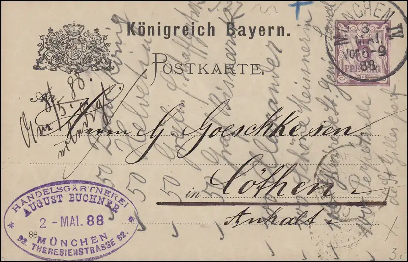 Carte postale de Bavière, paragraphe 5 Pfila DV 88: MÜNCHEN IV. 3.5.88 par Köthen/Anhalt