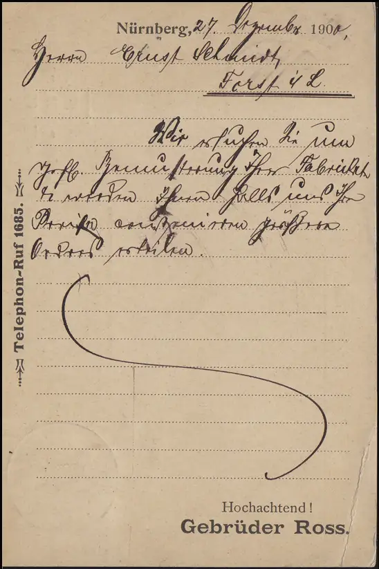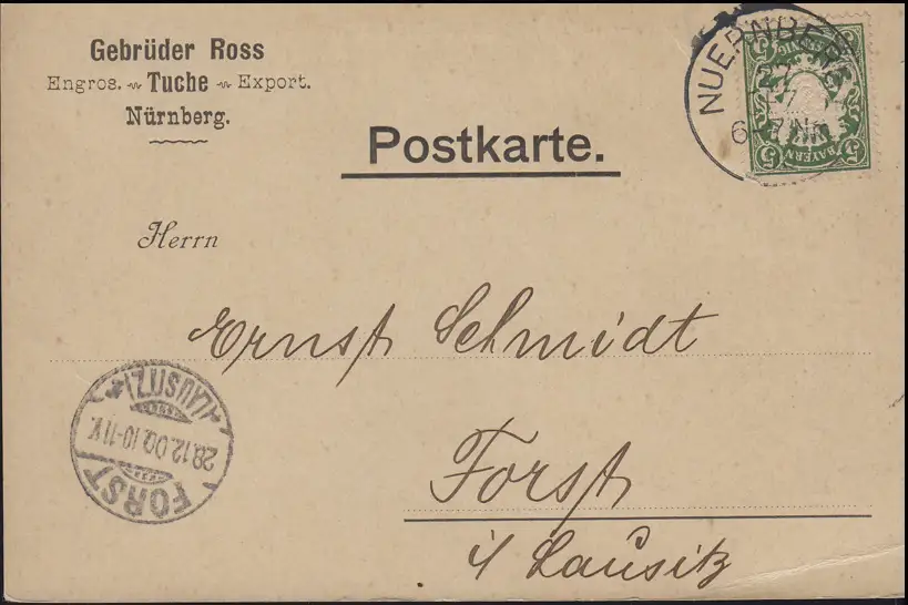 Bayern Wappen 5 Pf vert, PK Tuche-Export Ross NÜRNBERG 27.12.00 n. Forst 28.12.