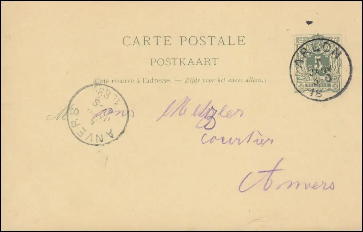 Belgique Carte postale P 22I chiffre d'ARLON 5.1.1888 après ANTISSER 5.1.8