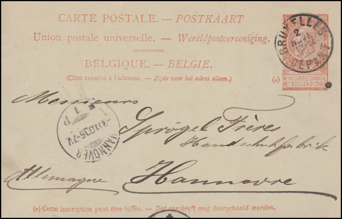 Belgique Carte postale P 31 Leopold BRUXELLES / BRUSELLES 2 11.1906 vers HANNOVER 3.11.