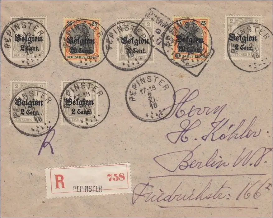 Belgique: Lettre de Pepinster à Berlin en 1918 comme lettre recommandée