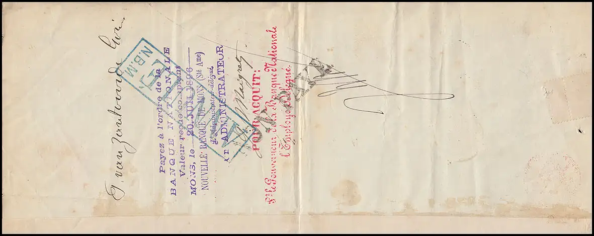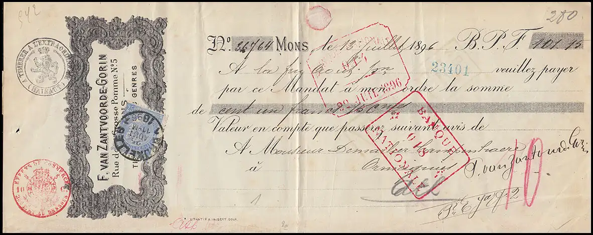 Belgique: chèque bancaire Mons B.P.F. 13.7.96 avec 55 timbres francs 25 C BRUXELLES 25.8.1896
