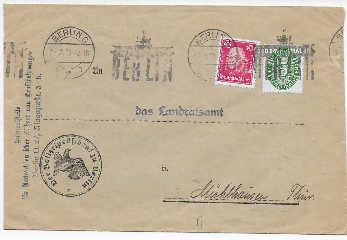 Berlin 1928 à Mühlhausen/Thür. avec trou POL et marque de service