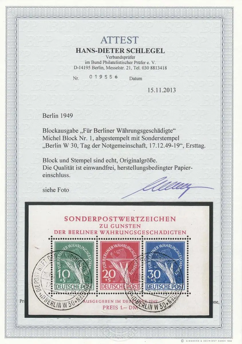 Berlin: Block 1, Stampon spécial, 1er jour, BPP Attest