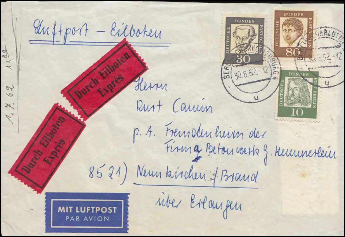 Berlin: Des Allemands importants 10, 30 et 80 Pf MiF Eil-Lp.-Lettre BERLIN 30.6.62