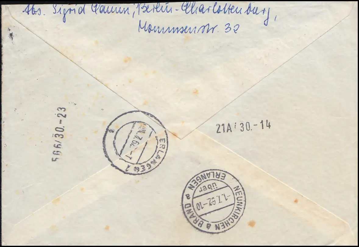 de BERLIN-CHARLOTENBURG 30.6.62 vers NOUVEAUXIRCHEN a BRAND via ERLANGEN 1.7.1962 Numéro de catalogue: 202+206+211 Examen: original Référence produit: 00000000017754>Note: Cet article n'est disponible qu'une seule fois. Vous recevrez exactement l'article représenté.