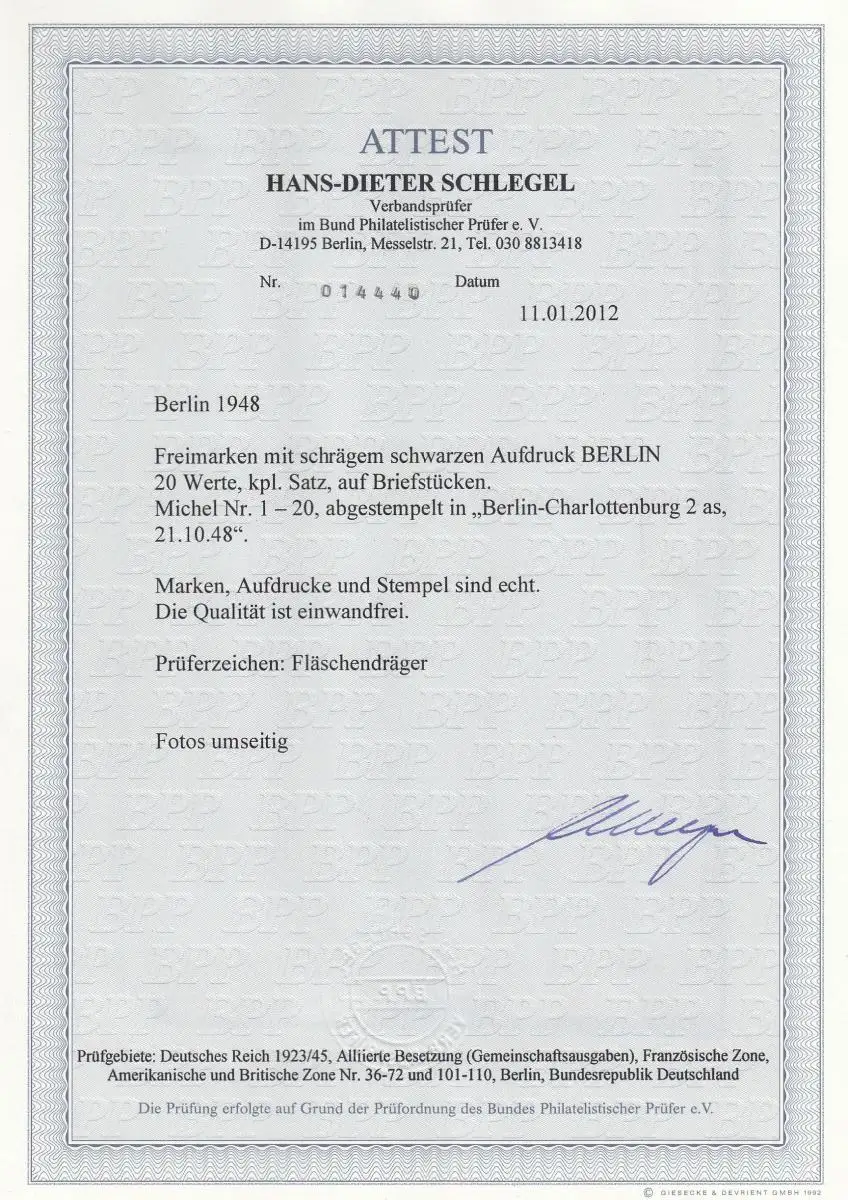 Berlin: Min. 1-20, Stampt Luxe, Berlin Charlottenburg 1948, BPP Attest