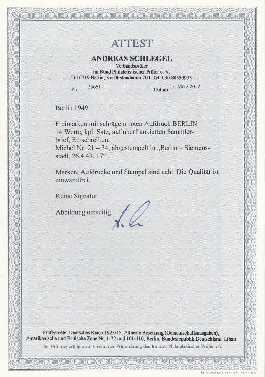 Berlin Min. 21-34, cacheté sur la lettre R 1949, BPP Attest