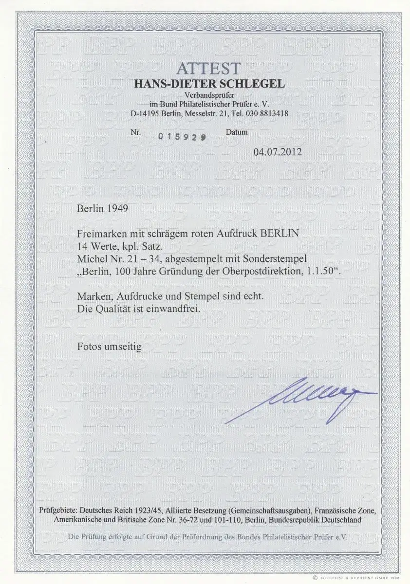 Berlin: Min. 21-34, cachet spécial 1950, BPP Attest