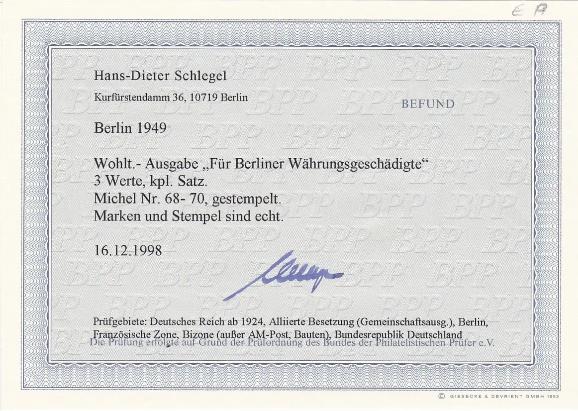 Berlin: Min° 68-70, cacheté, résultat BPP