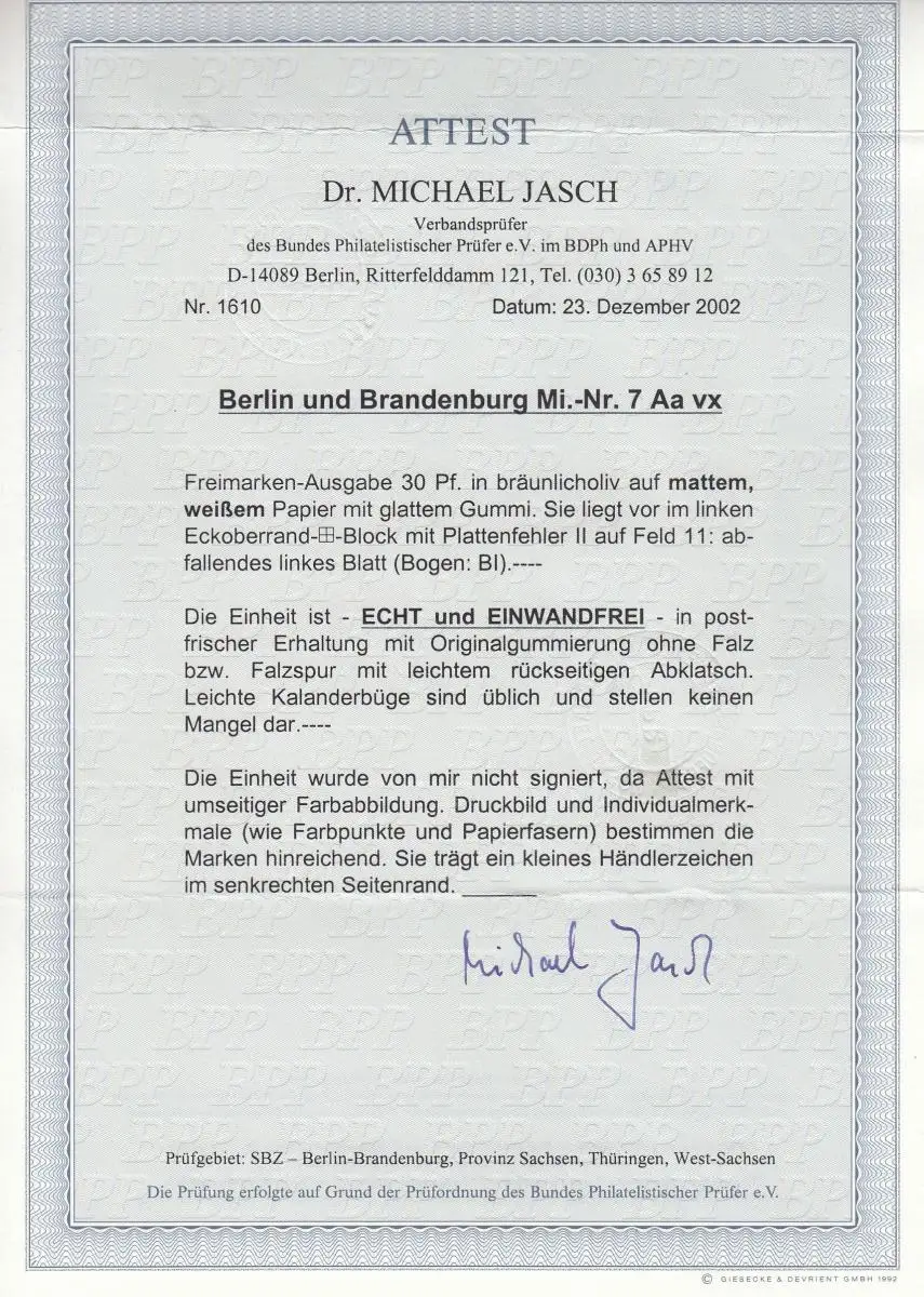 Berlin Min. 7 Aa vx, papier blanc, erreur de plaque II, frais, ** BPP Attest