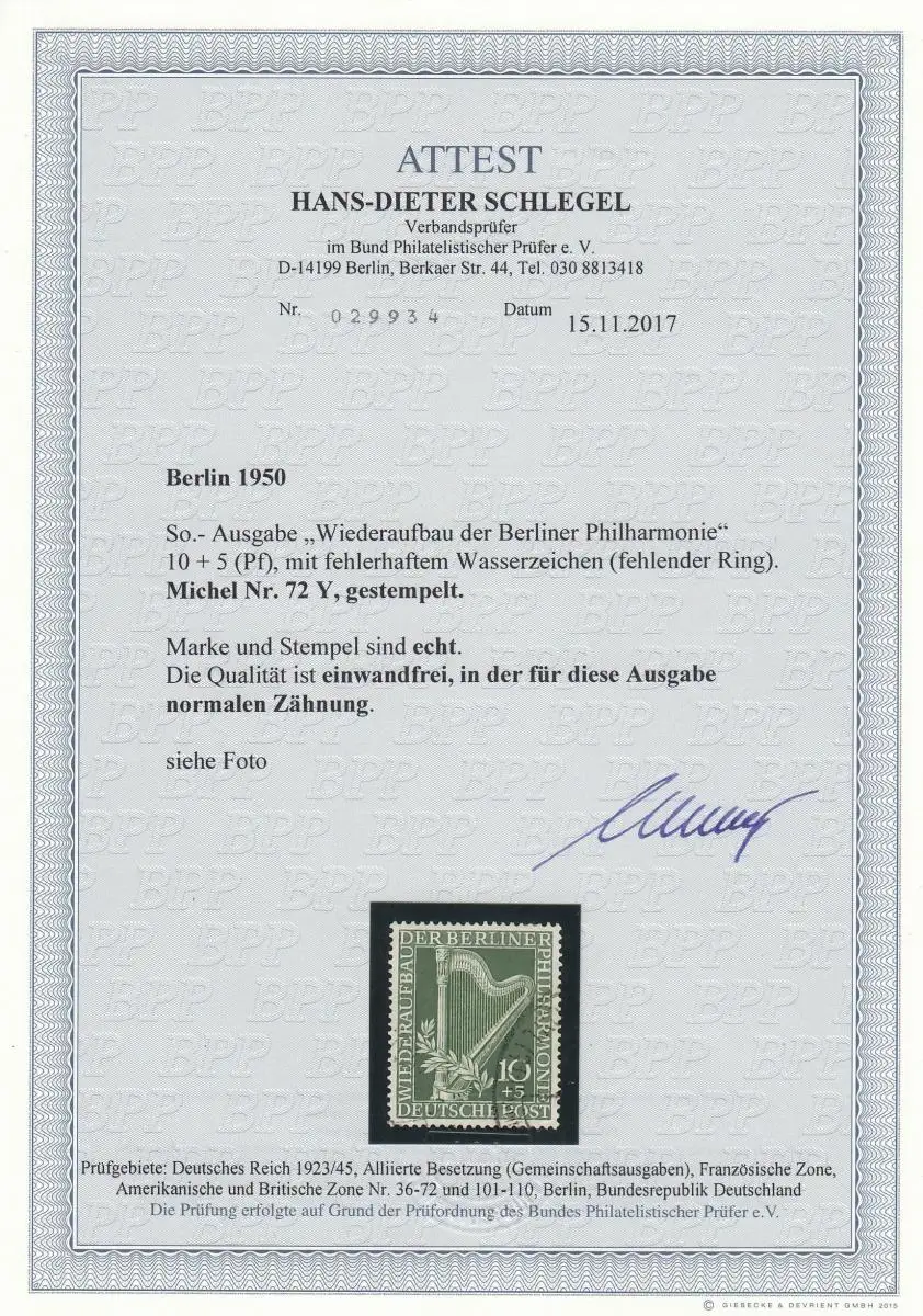 Berlin: Michel N° 72 Y, cacheté avec BPP Attest