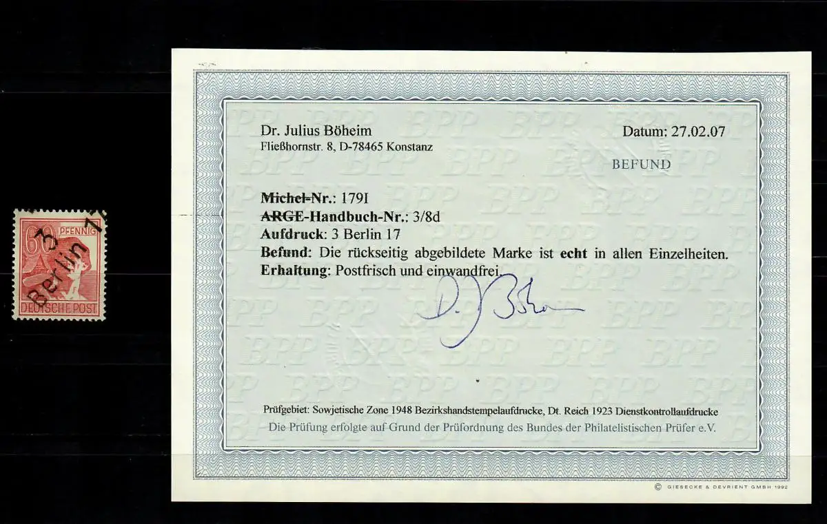 Berlin Min. 179 I, frais, **, impression 3 Berlin 17, BPP résultat