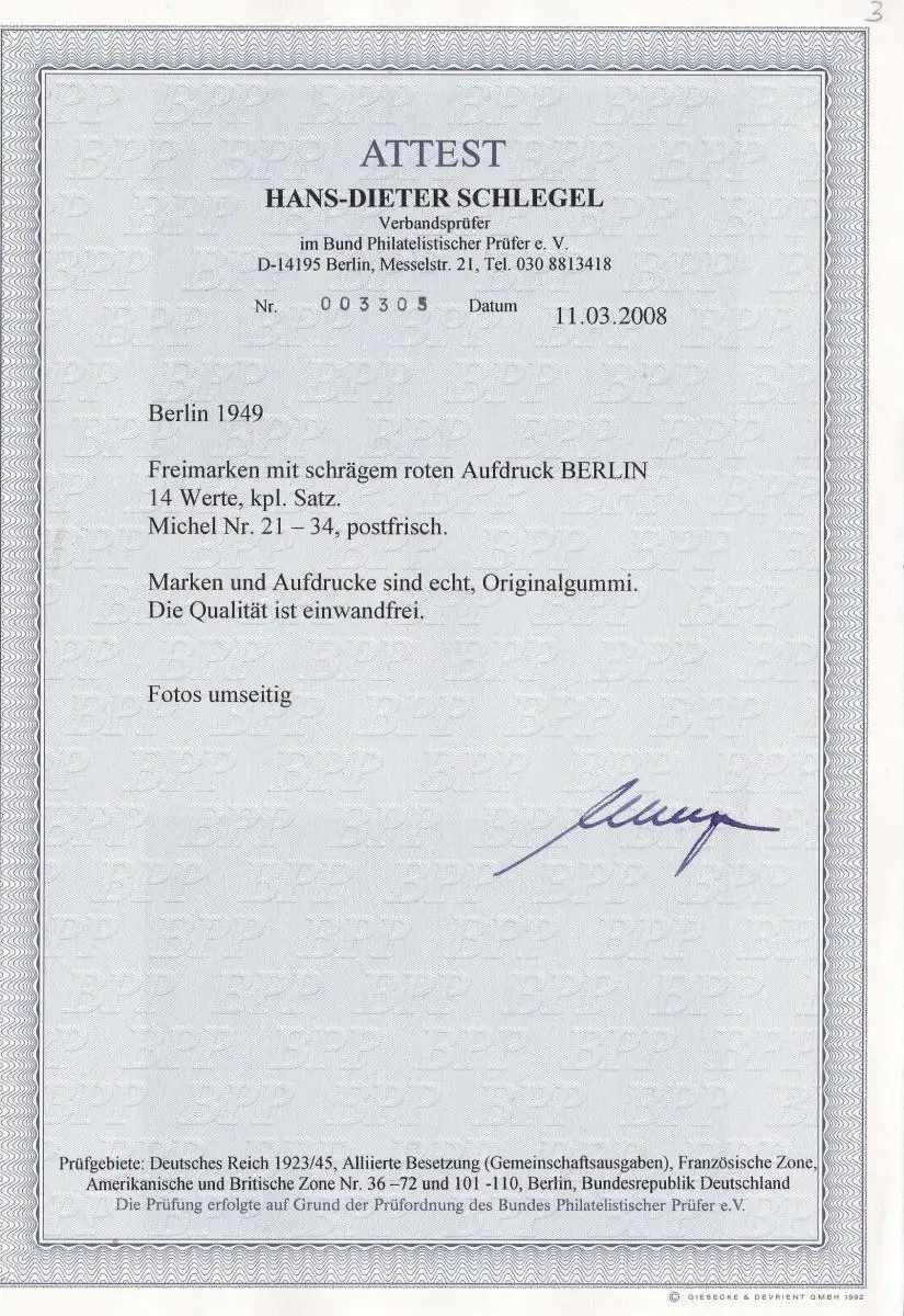Berlin: Rouge imprimé: MiNr. 21-34, post-freich, BPP Attest