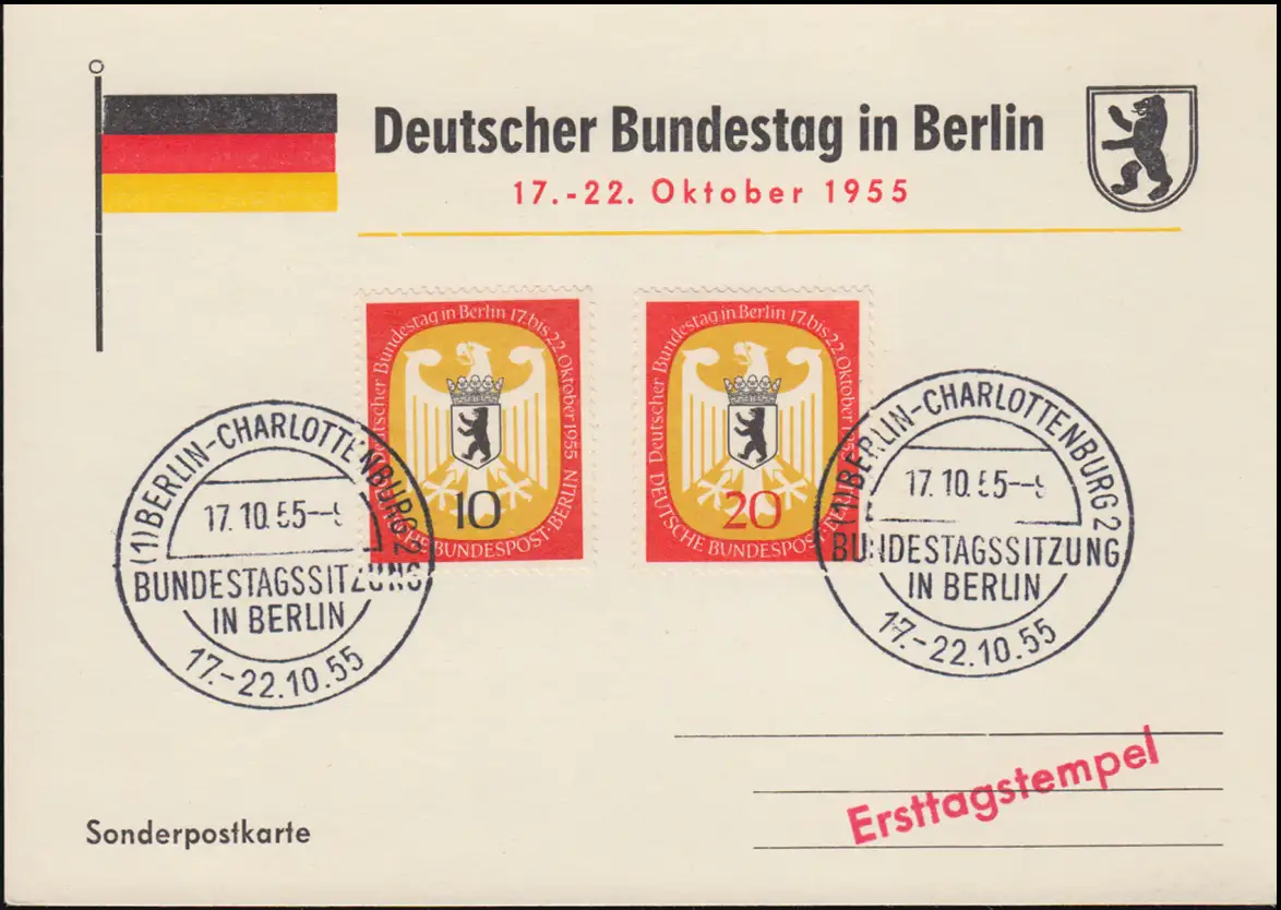 Carte postale spéciale de Berlin Carte max. 129-130 Bundestag à Berlin ESSt 17-22.10.55