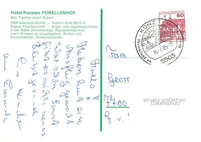 Bescheid_Hermeskeil Hotel Pension Forellenhof Flugaufnahme Bescheid Hermeskeil postalisch gelaufen 1985 Erhaltung siehe scans [LiesaD40] LiesID40