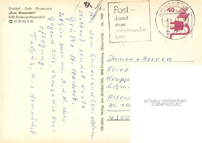 Bestwig Kategorie Alte Ansichtskarten Postkarten bx45681 Bestwig Gasthaus Cafe Restaurant Zum Wasserfall Bestwig postalisch gelaufen 1977 Erhaltung siehe scans [LiesaD40]