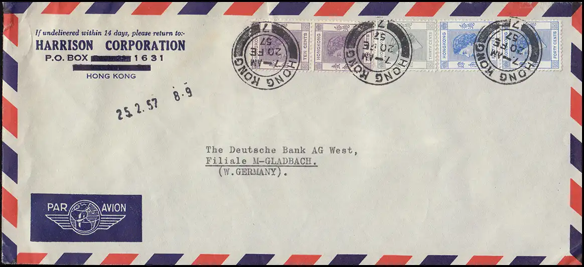Bf. de Harrison Corporation HONG KONG 20.2.57 à Deutsche Bank Mönchengladbach
