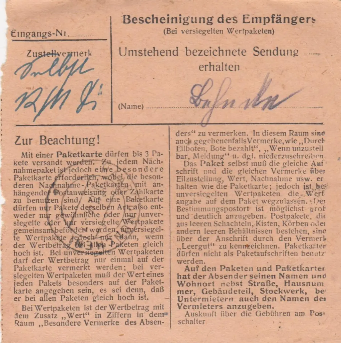 BiZone Carte de paquet 1948: Rosenheim vers Ottendihl, carte de valeur 100 FF