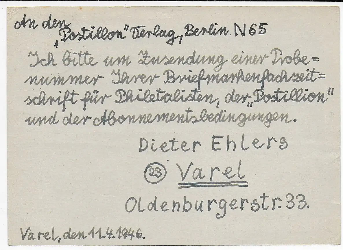 BiZone: Carte postale Varel 1946 vers Berlin