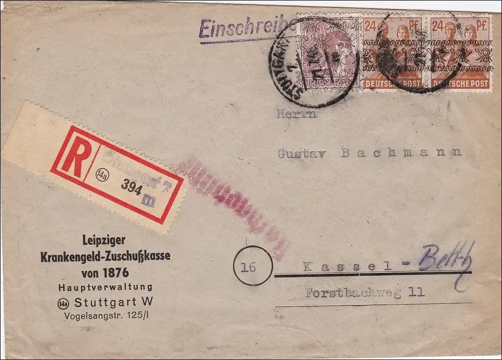 BiZone: Lettre recommandé de Stuttgart à Kassel 1948