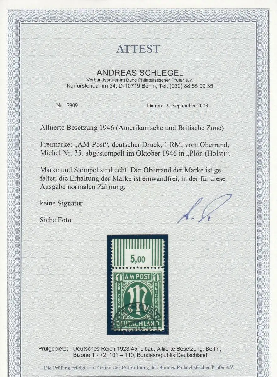 BiZone MiNr. 35, cacheté par le bord supérieur avec BPP Attest
