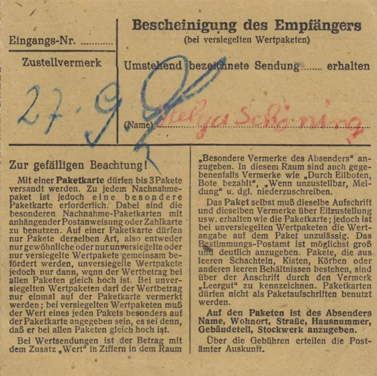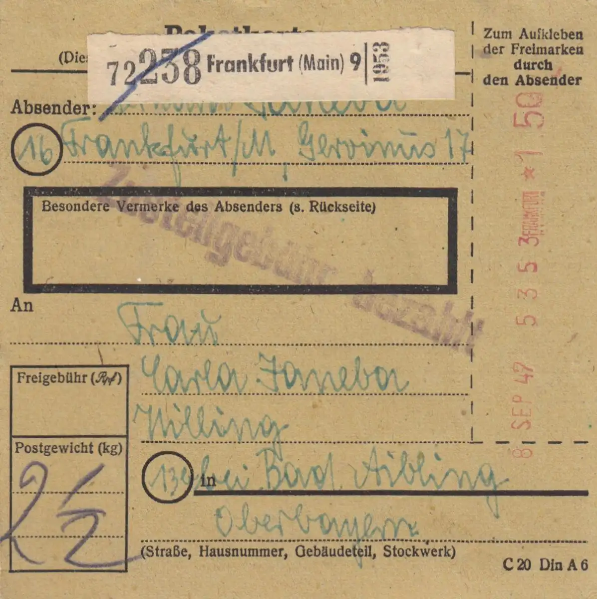 Carte de paquet BiZone 1947: Francfort vers Bad Aibling