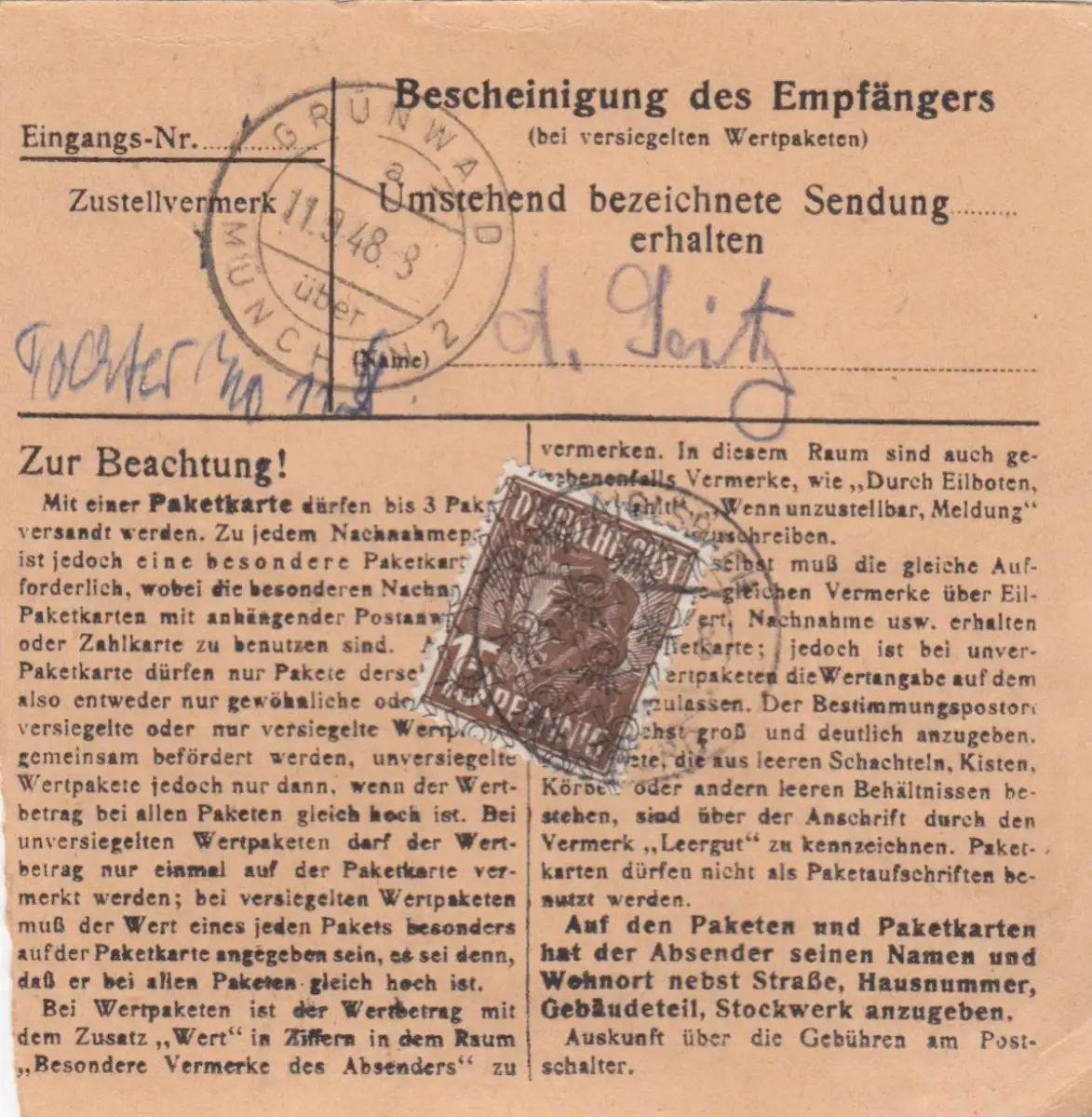 BiZone Carte de paquet 1948: Aiglsbach vers Neu vertwald près de Munich