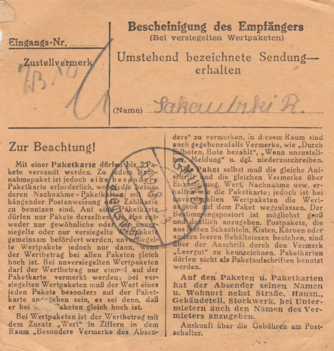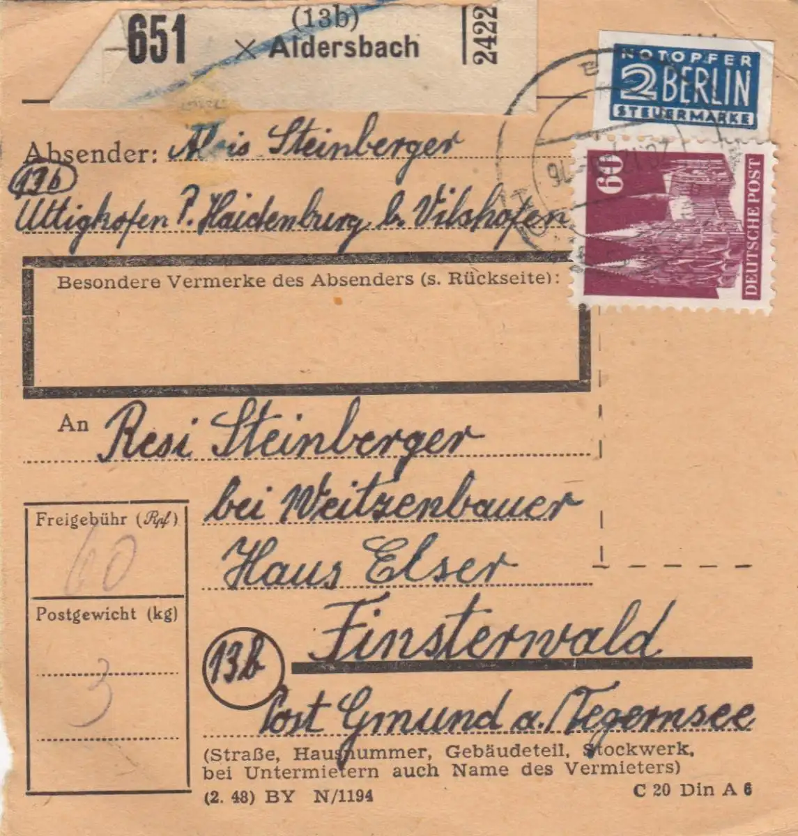 Carte de paquet BiZone 1948: Aldersbach vers Finsterwald