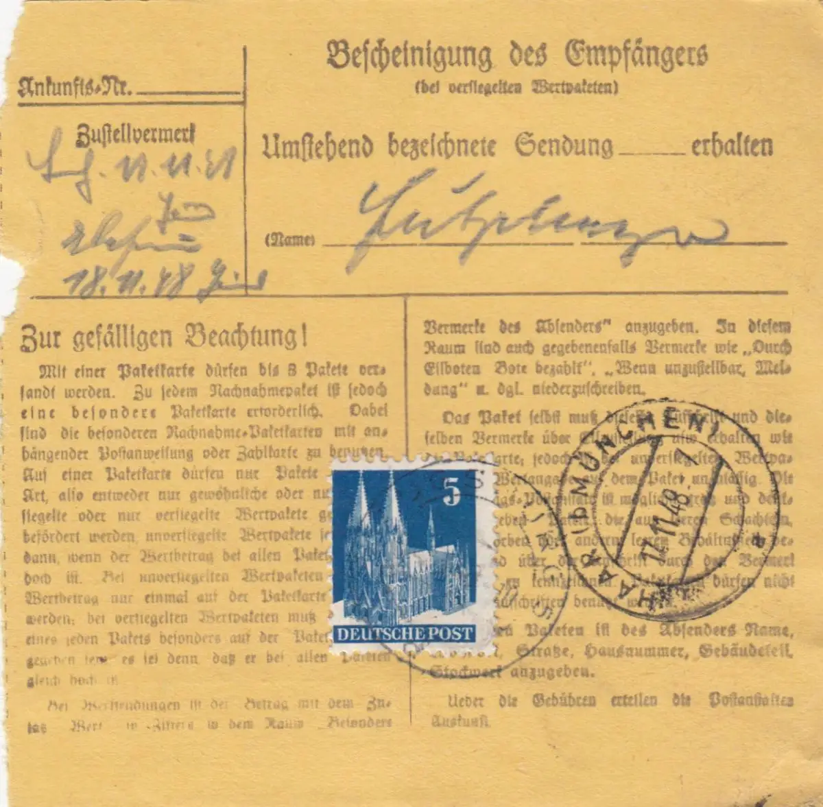 Carte de paquet BiZone 1948: Augsburg, Nagler & Fils par cheveux, carte de valeur