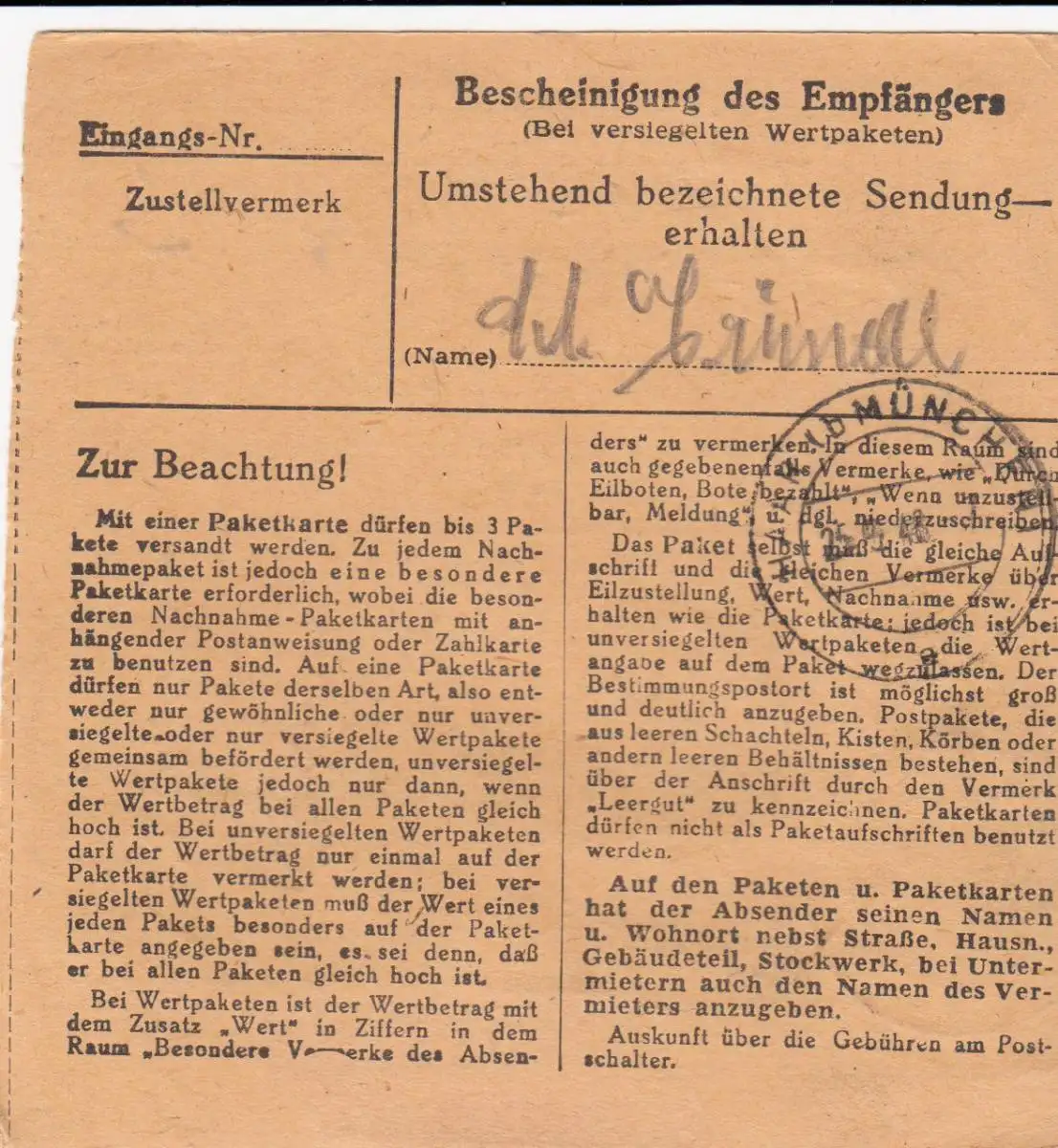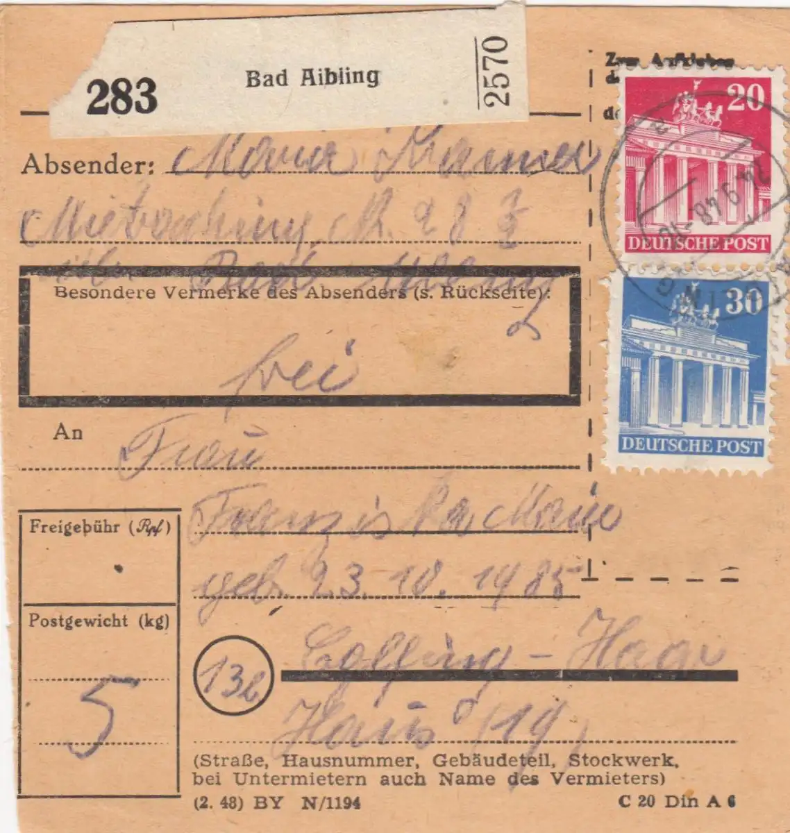 Carte de paquet BiZone 1948: Bad Aibling vers Eglfing-Haar