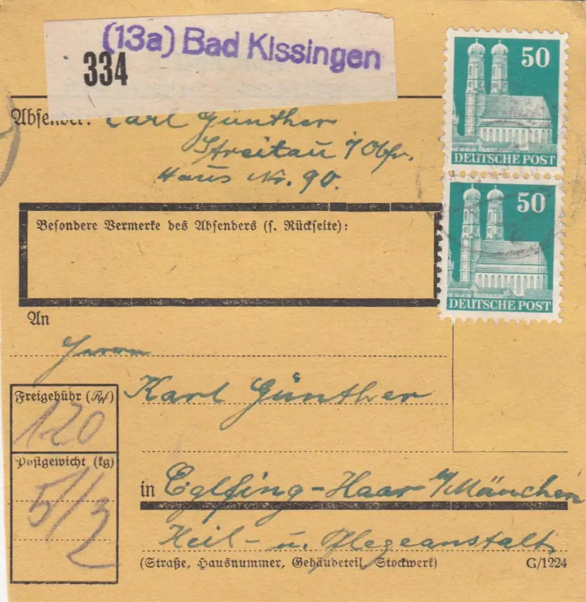 Carte de paquet BiZone 1948: Bad Kissingen après Eglfing-Haar, centre de soins et de santé