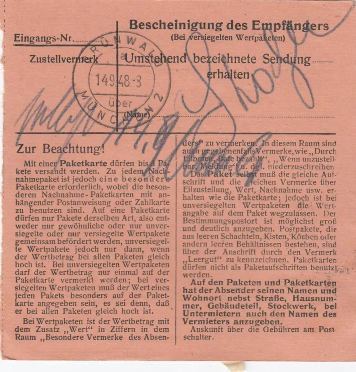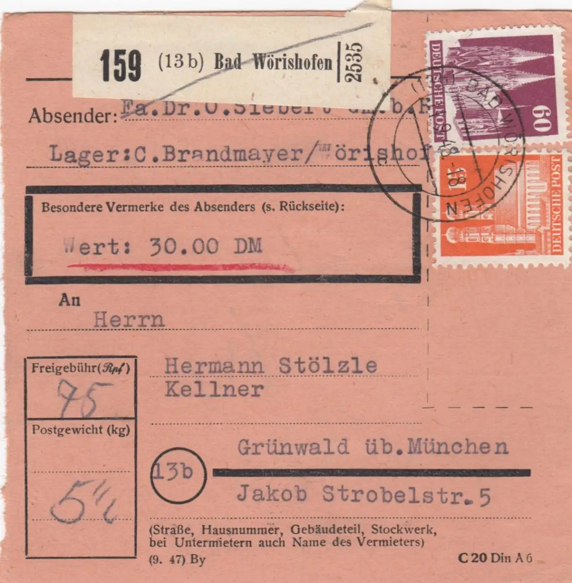 BiZone Carte de paquet 1948: Bad Wörishofen n. Grünwald, serveur, valeur 30 FF