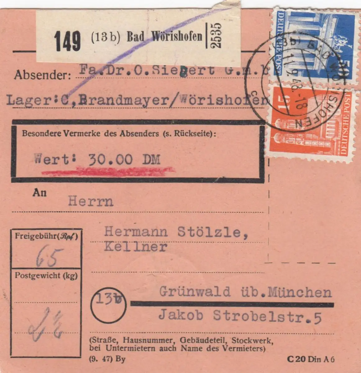 Carte de paquet BiZone 1948: Bad Wörishofen vers Grünwald, carte de valeur