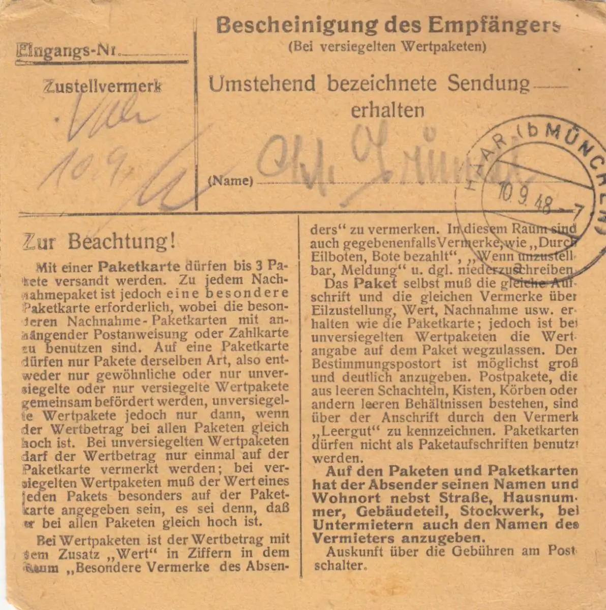 Carte de paquet BiZone 1948: Bayersich-Gmain selon Haars Antalt Eglfing
