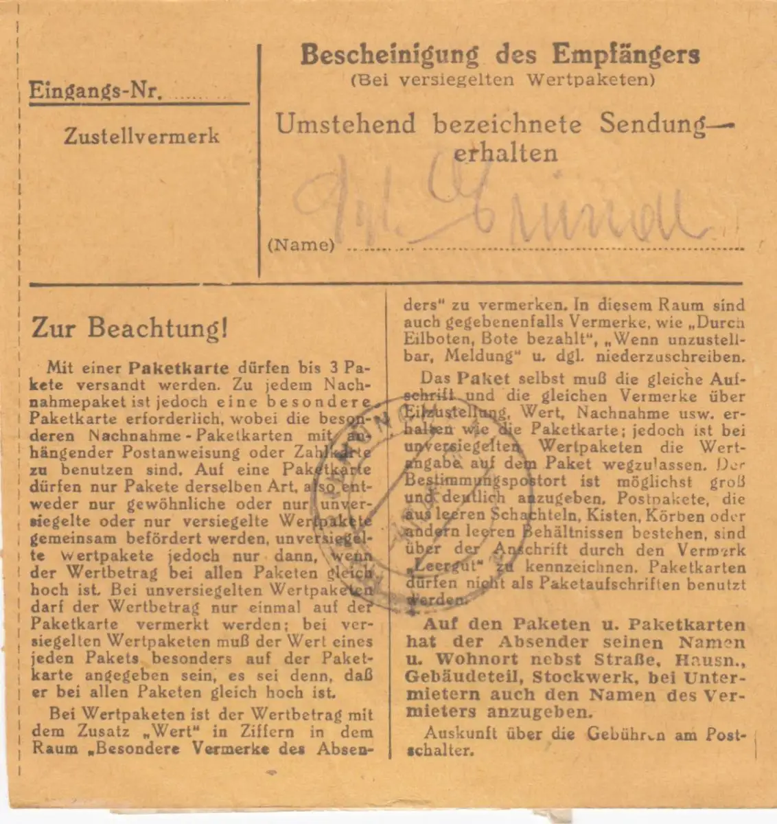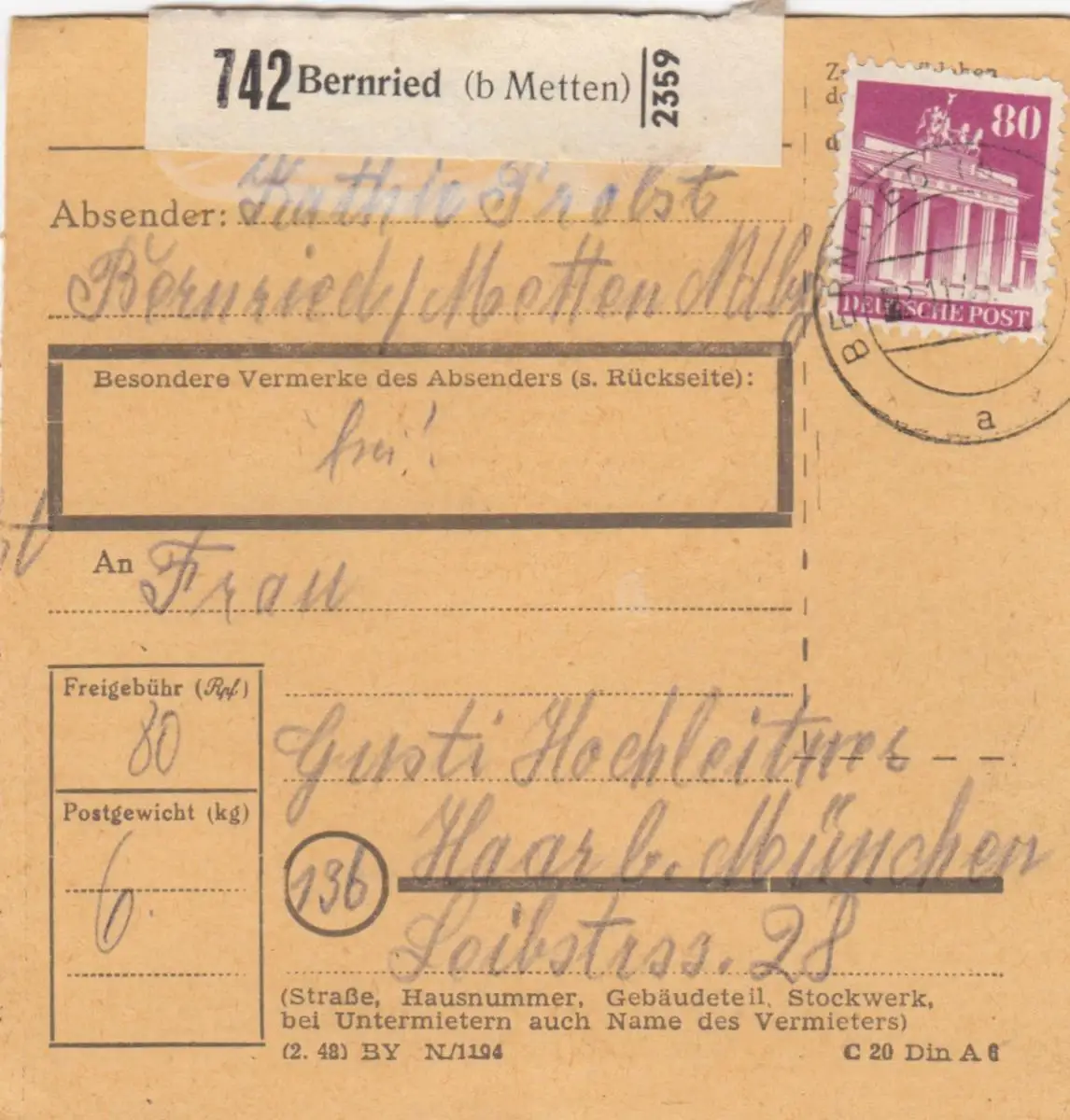 BiZone Carte de paquet 1948: Bernried bei Metten b. Munich