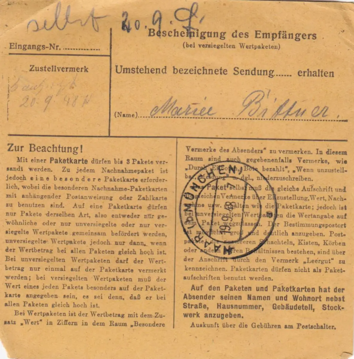 Carte de paquet BiZone 1948: Archenberg vers Haar près de Munich