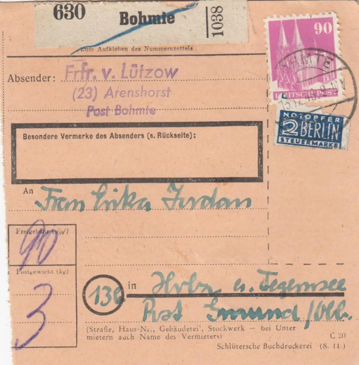 Carte de paquet BiZone 1948: Bohmte selon bois au Tegensee, victimes d'urgence