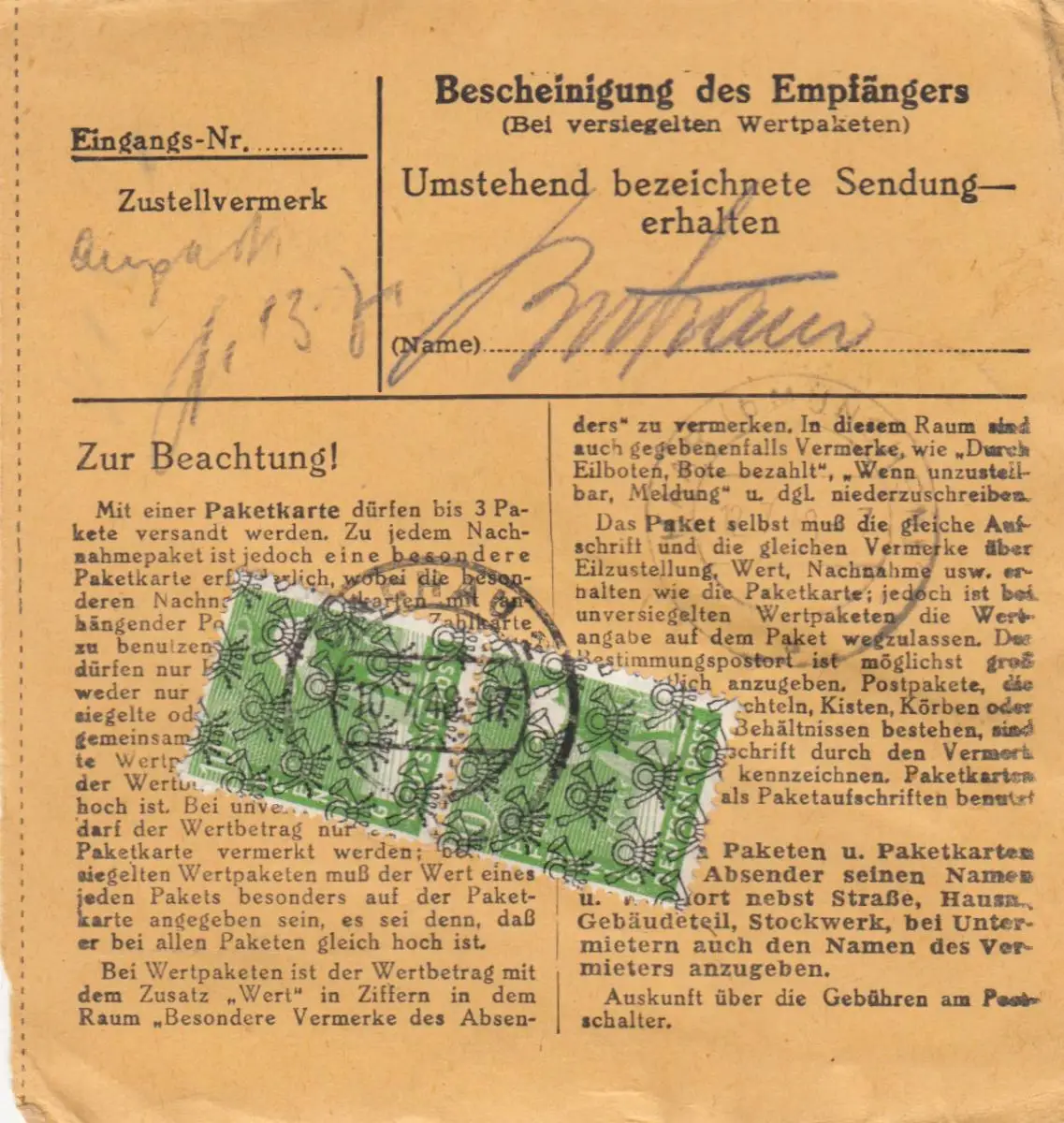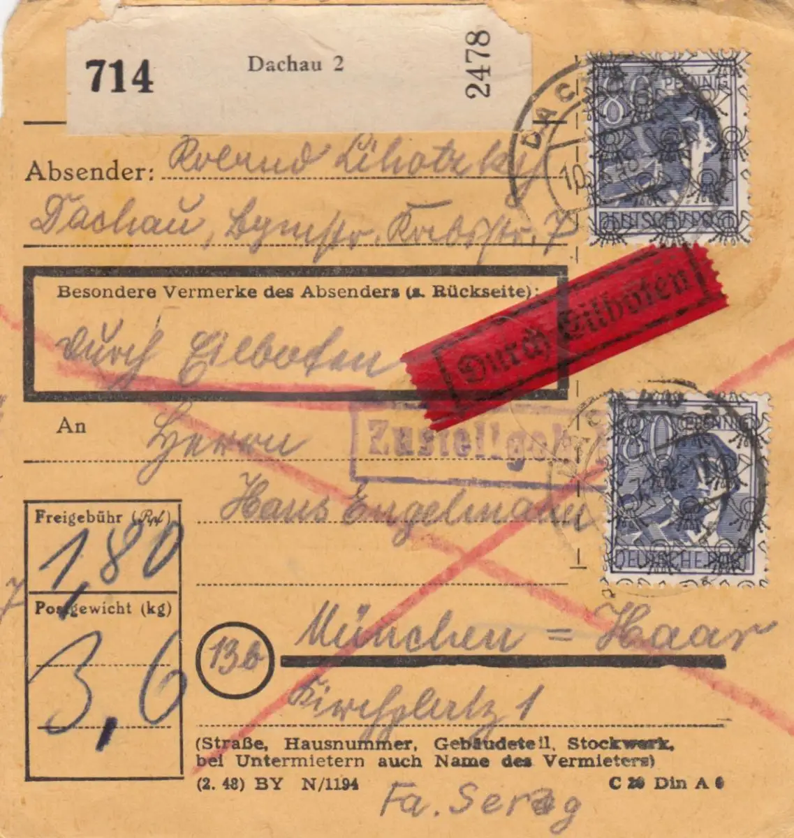 Carte de paquet BiZone 1948: Dachau selon les cheveux, Maison Engelmann, par les émissaires
